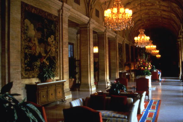 The hotel's elegant lobby features glittering christmas trees and lighted birch branches decked out with 135,572 lights and 2,200 glass ornaments.